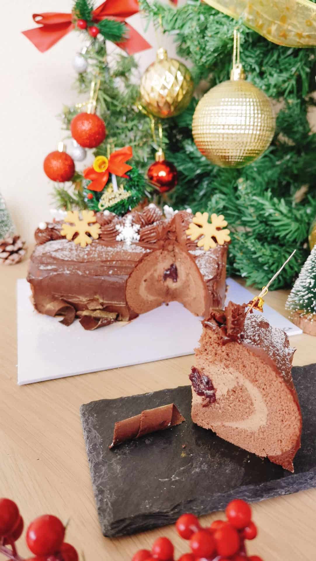 Chocolate Swiss roll sandwich with 70% dark chocolate custard cream, ganache and dark sweet cherries, coat with 70% dark chocolate ganache and fresh cherries